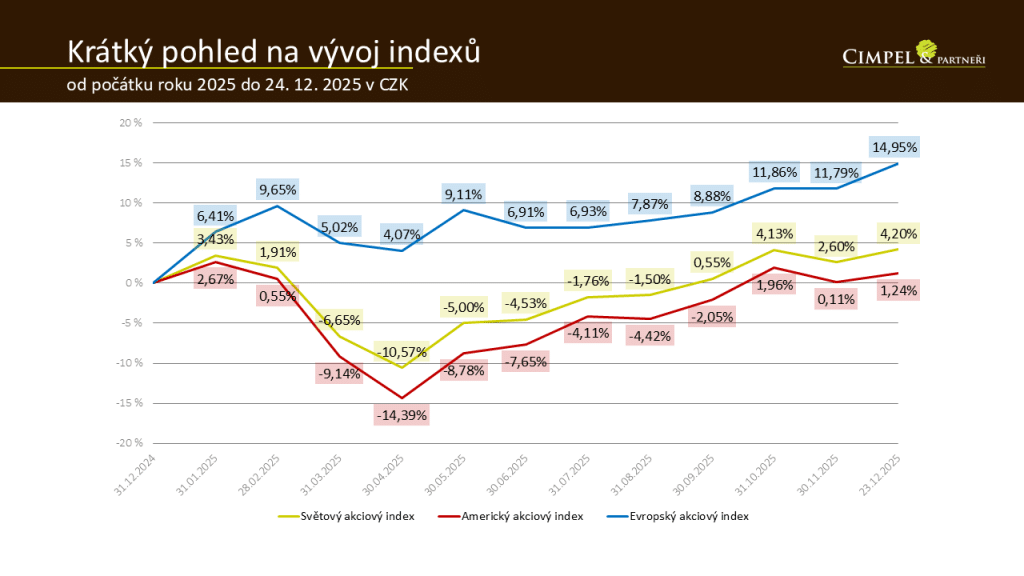 Dan: Velmi zajímavý je pohled na pražskou burzu. Ta v roce 2025 vzrostla o 46 %, což byl jeden z nejlepších výkonů na světě. Silné byly také evropské akcie a japonský trh. Pokud se podíváme na evropský akciový index přepočtený do české koruny, vidíme růst o 15 %. Světový index, který zahrnuje Evropu, Ameriku i další regiony, vzrostl o 4,2 %. To ukazuje, že Evropa byla v loňském roce velmi konkurenceschopná.