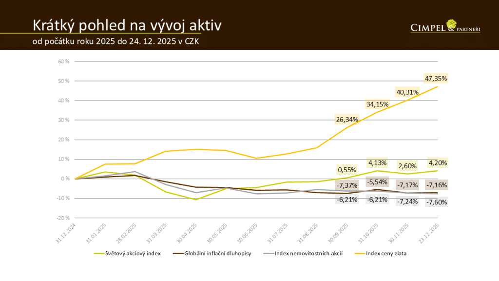 A pokud bych měl vybrat skutečného vítěze roku, pak to bylo zlato. Tento vývoj je zajímavým signálem – investoři věří v pokračování růstu, ale současně se snaží chránit před systémovými riziky, která mohou v takových obdobích nastat.