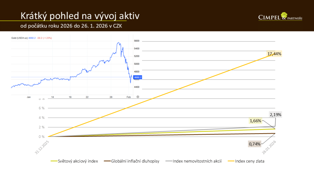 Jiří: Když se podíváme na krátký pohled na vývoj aktiv od začátku letošního roku, vidíme, že vítězem k 26. 1. bylo zlato s výnosem 17 %, což je až abnormální. My ale natáčíme 2. 2., po víkendu, kdy v tomto mezidobí došlo na zlatě k výrazné korekci. 17,5 % dolů není úplně běžný pohyb, zkus to okomentovat — co se stalo a co to znamená do budoucna?