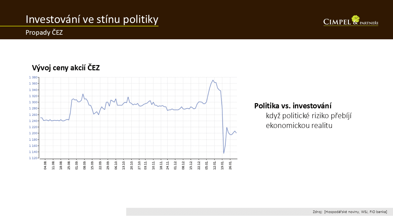 Jiří: Je to vždy výzva při nákupu akcií jedné konkrétní firmy – trefit správný okamžik a ustát potom podobné výkyvy, protože ty k tomu patří. My se akciím ČEZ vyhýbáme, protože jde o příliš velkou sázku na jeden region a v kombinaci s většinovým vlastnictvím státu a nejistotou ohledně budoucnosti nám to v portfoliích „nehraje do karet“. Mnoho investorů ale ČEZ v portfoliu má, proto vnímáme jako důležité toto téma zmínit.