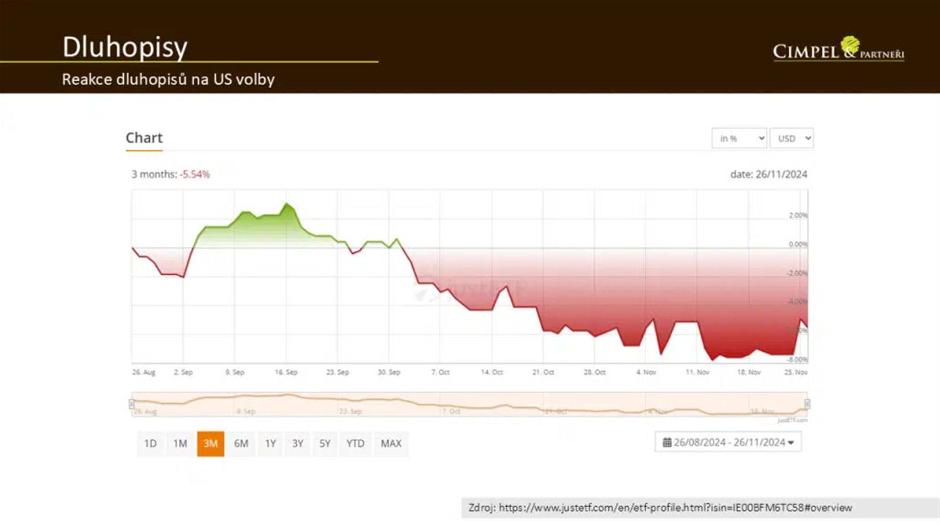 Když se podíváme na konkrétní aktiva, kterým zvolení pomohlo velmi citelně, byly to třeba akcie Tesla, které vyskočily o 40 % během krátkého okamžiku. Můžeme vidět i Bitcoin, který reagoval velmi rychle a z ceny 70 tisíc dolarů za Bitcoin se chvíli držel hranice na úrovni 100 tisíc, což byl dlouhodobý pomyslný milník, kam se snažil Bitcoin dostat. Chci na tom ukázat, že změna ceny těchto aktiv, ať to byly akcie Tesla nebo cena Bitcoinu, nestojí na změně fundamentu.