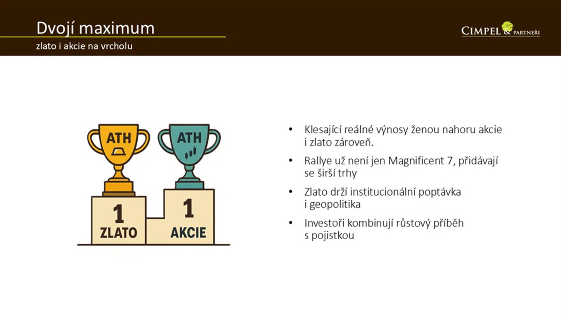 Dan: Je dobré si uvědomit, proč to tak je. Jednu z věcí jsme už říkali. Růst ceny zlata je tažený geopolitikou a tím, že ho poptávají instituce. Růst akcií je tažený tím, že se začaly snižovat úrokové sazby.