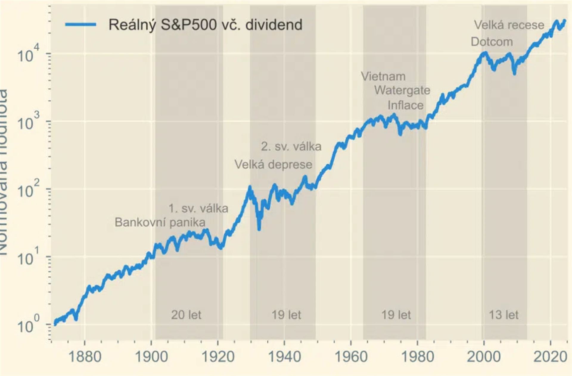 Vývoj hodnoty aggregovaného indexu S&P 500 (R. J. Shiller, Yale Uni) vč. reinvestice dividend a opravený o americkou inflaci. Hodnota v roce 1871 je normovaná na jedničku, maximum k 1. 6. 2024 činí 31 283, levá osa je logaritmická. Nejdelší horizonty v každém ze čtyř období bez reálného zisku jsou označeny šedě. Zdroj: https://skejwin.cz/ztracene-dekady-jak-valcit-s-investicnim-strachem
