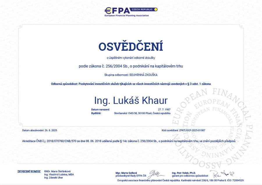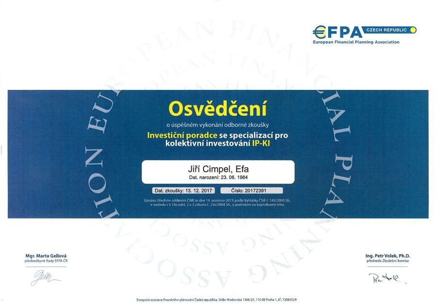 - EFP – European Financial Planner – mezinárodně uznávané zkoušky finančního plánování, 2017 – 2018